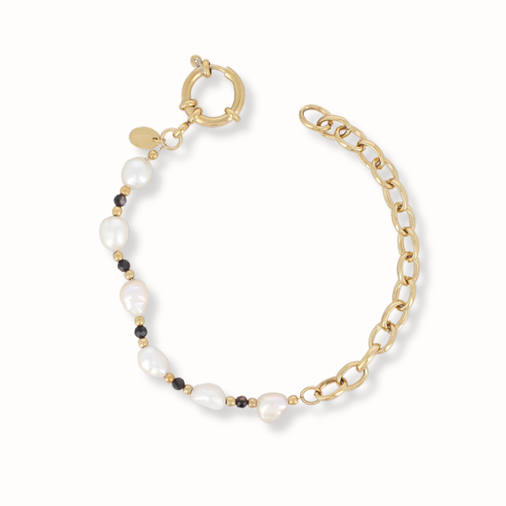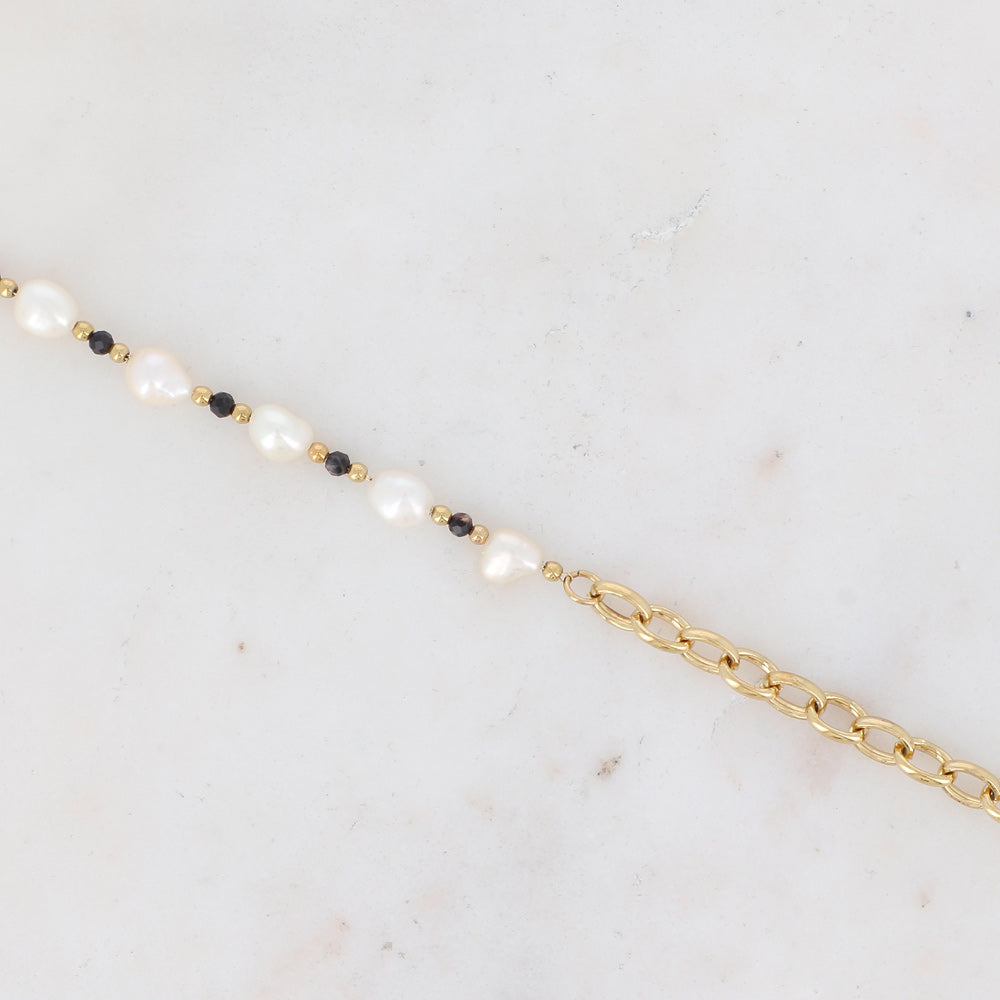 Le bracelet Athena est un exemple d'élégance naturelle, alliant avec finesse les perles d'eau douce irisées et l'onyx naturel, pierres réputées pour leur caractère apaisant et fortifiant.