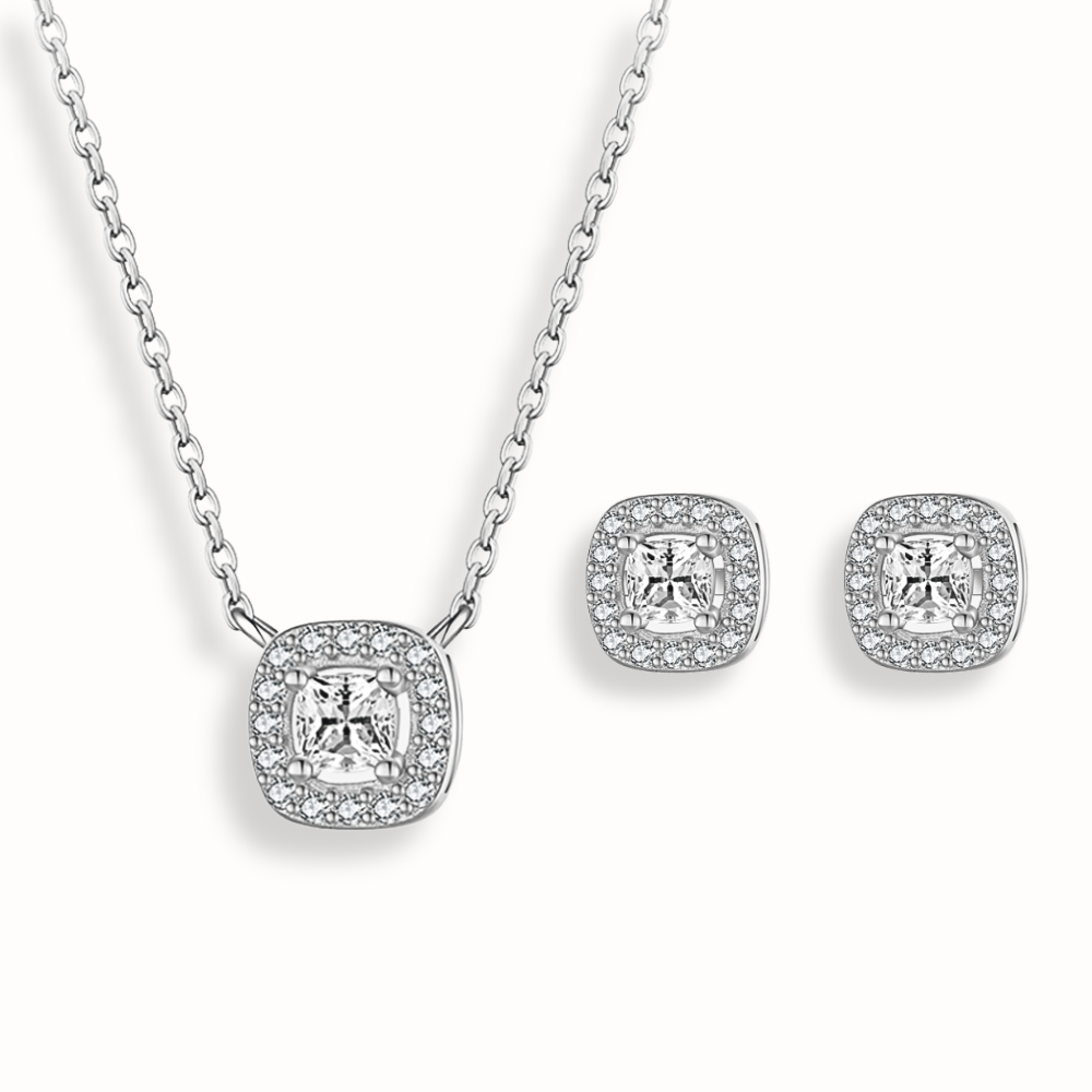 Cet ensemble allie force et sophistication, inspiré de la grandeur des dieux. Le collier est conçu avec des pierres carrées de zircon, symbolisant la sagesse et la clarté, tandis que les boucles d'oreilles complètent l'ensemble avec des pierres carrées assorties, ajoutant une touche moderne et intemporelle. Le tout est réalisé en argent 925 rhodié, assurant un éclat brillant et élégant.