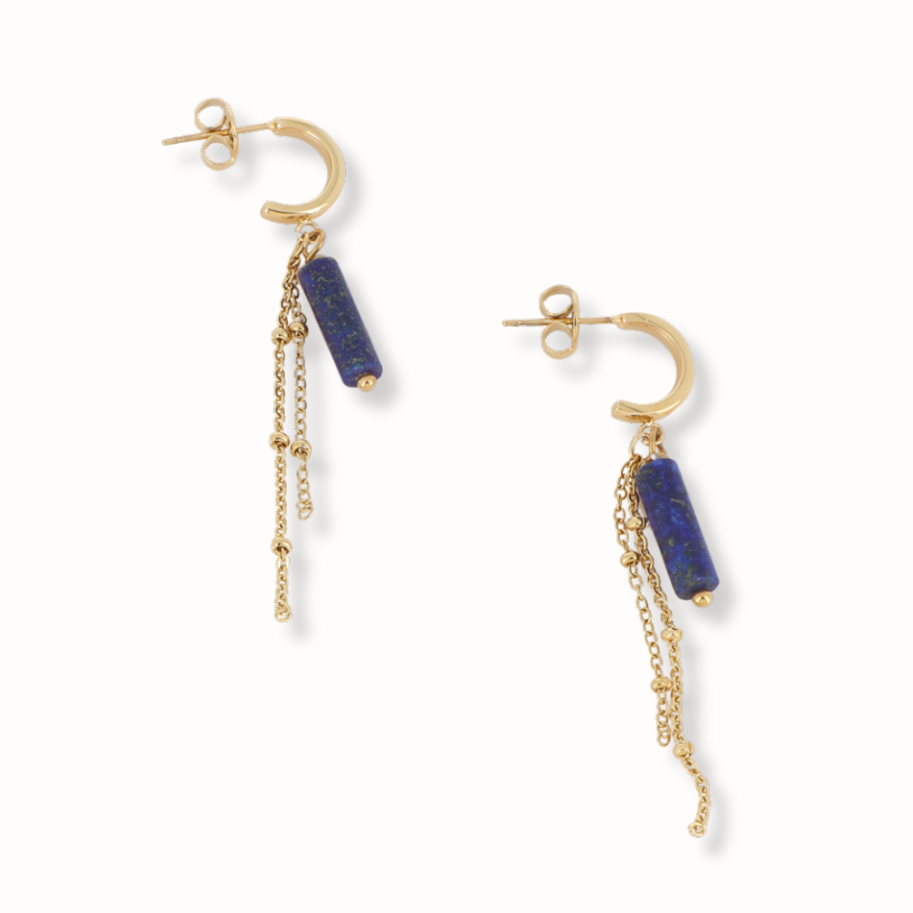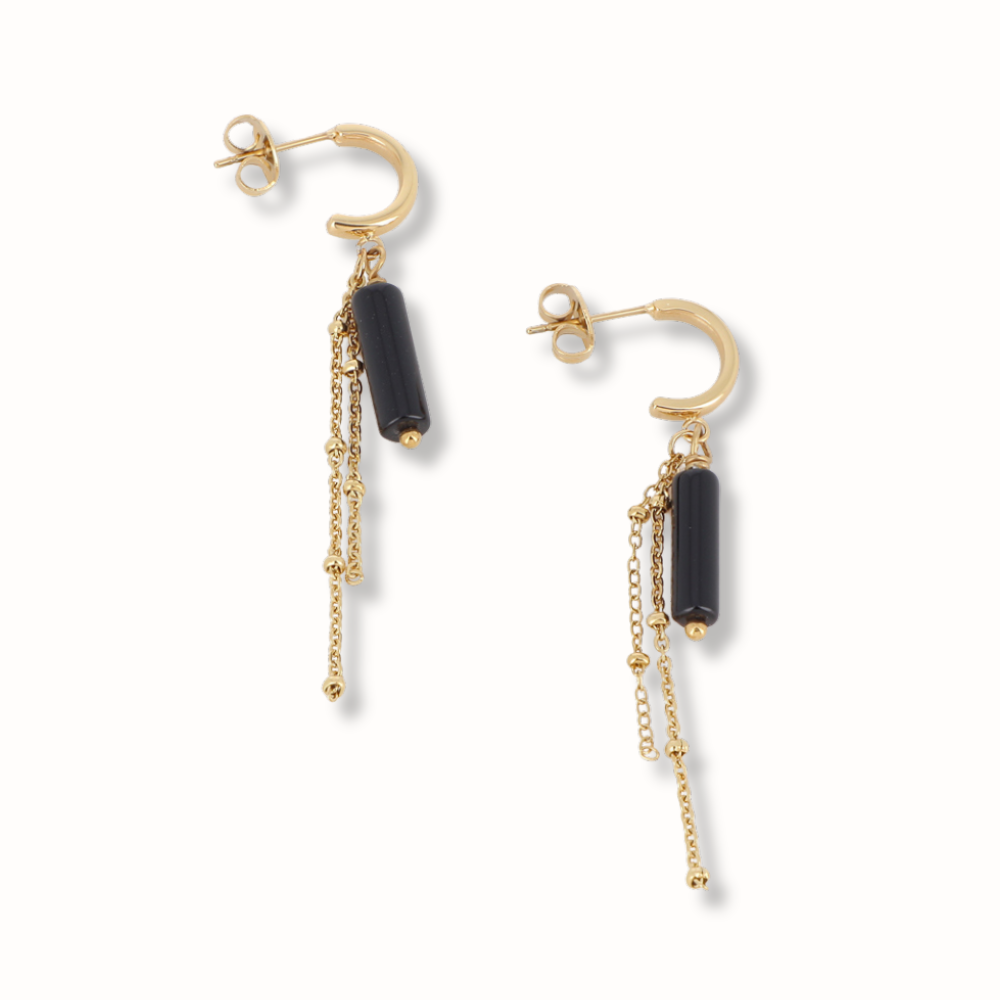 Les boucles d'oreilles EBEN captivent par leur design minimaliste, mettant en vedette des cylindres noirs suspendus à des chaînes dorées délicates. Le contraste saisissant entre la teinte sombre des pierres et l'éclat des chaînes confère à ces créoles une allure à la fois moderne et classique.