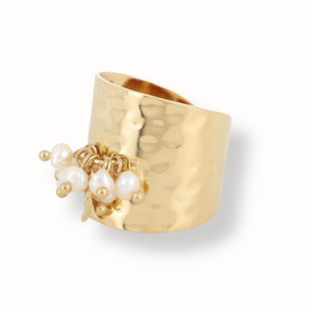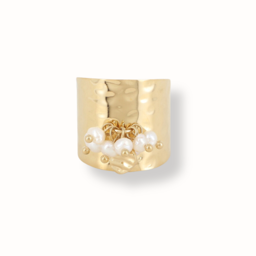 La bague KURSA présente un effet écaille et est agrémentée d'une pampille de cœur texturée ainsi que de petites perles d'eau douce naturelles. Elle vient sublimer votre main avec élégance.