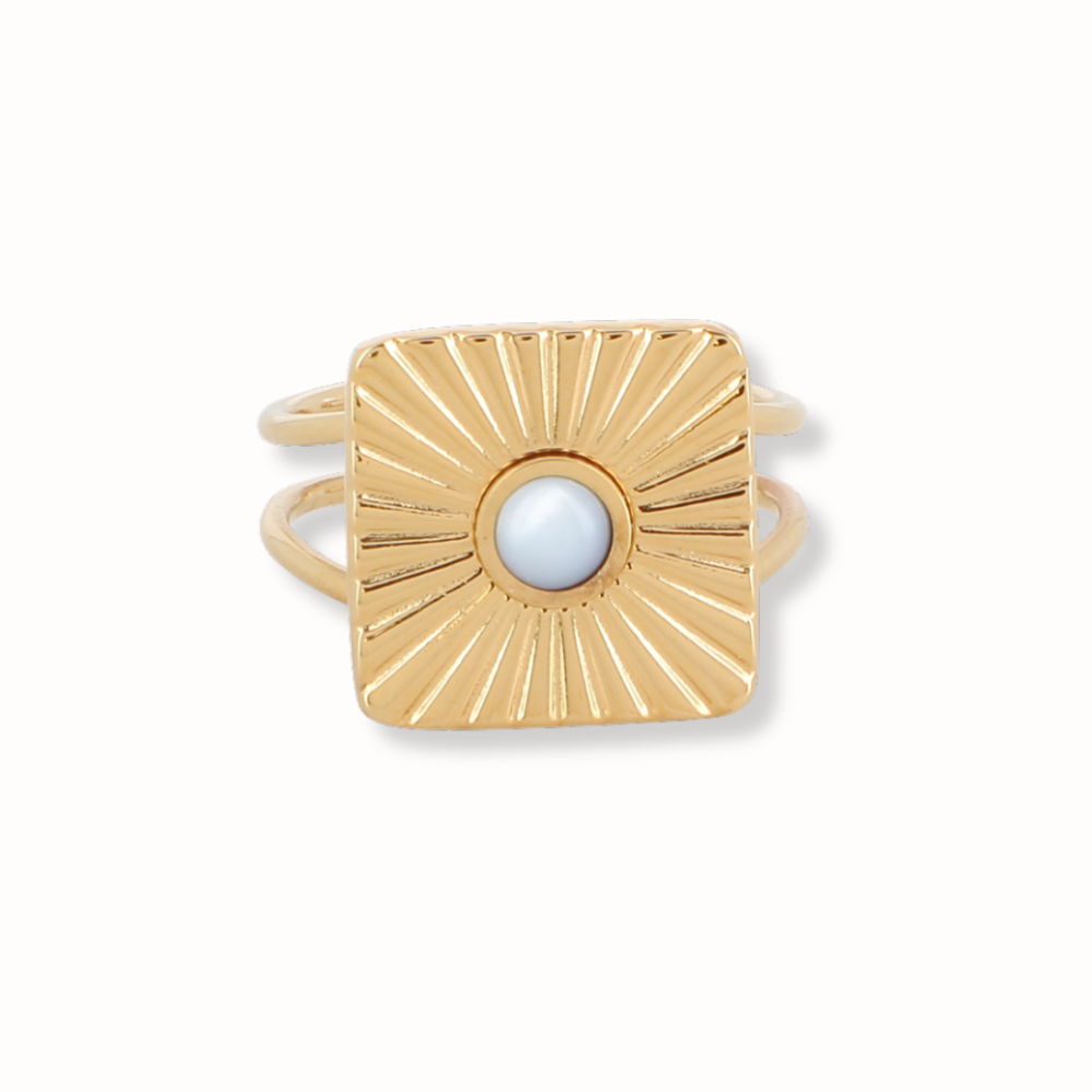 Comme les premiers rayons du soleil perçant un ciel azur, cette bague carrée, avec sa nacre éclatante et ses lignes radieuses, incarne la recherche de l’harmonie. Sa lumière douce et ses courbes parfaites enveloppent le doigt comme un éclat de lumière dans un monde où chaque instant devient une œuvre d’art.