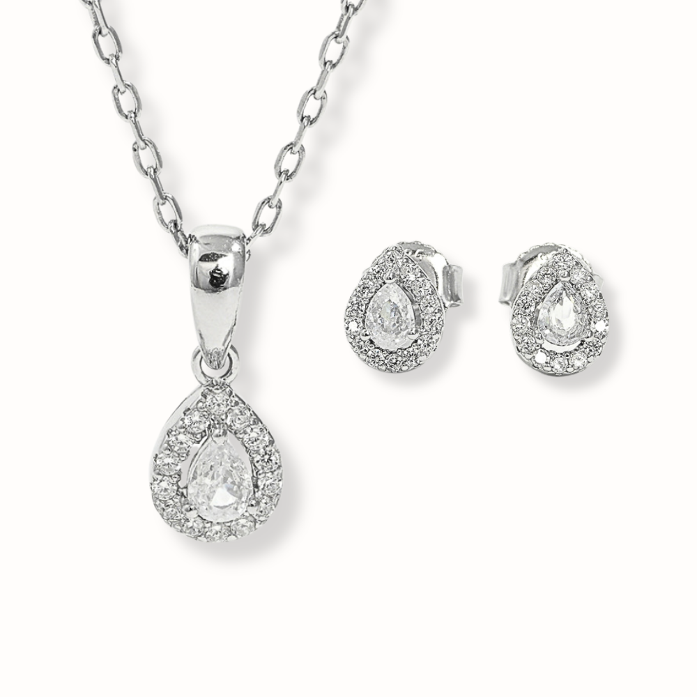 Cet ensemble de collier et de boucles d'oreilles, inspiré de la beauté divine d'Aphrodite, met en avant des pierres de zircon en forme de goutte. Conçu pour capturer l'essence de l'élégance et du charme, il allie simplicité et raffinement, créant un équilibre parfait entre modernité et romantisme. Réalisé en argent 925 rhodié, il offre une finition brillante et sophistiquée.