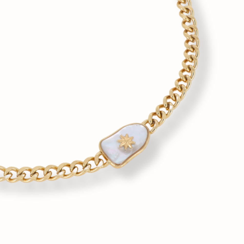 Découvrez le collier Astrea, un bijou raffiné orné d'un pendentif nacré qui capture la lumière avec éclat, agrémenté d'une étoile dorée. Ce collier embellira vos tenues estivales avec élégance.