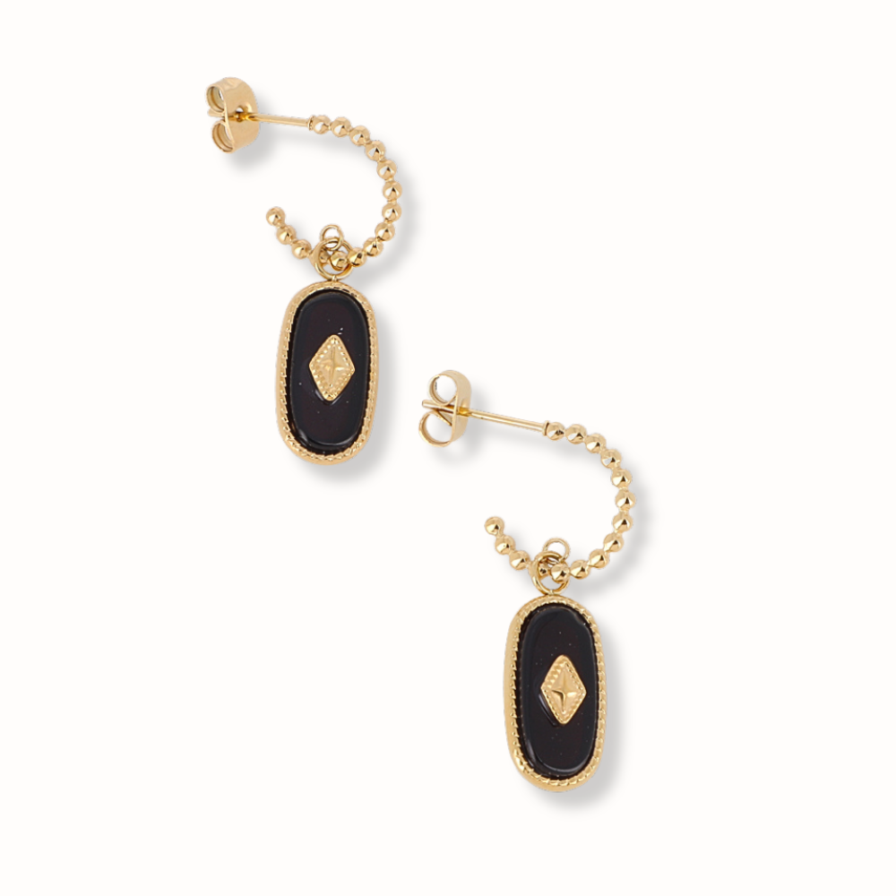 Ces boucles d'oreilles en onyx naturel monté sur acier inoxydable doré font écho à la sagesse intemporelle de la déesse grecque Athéna. Le design élégant et minimaliste de l'onyx noir, associé à l'acier doré, crée une parfaite harmonie entre puissance et raffinement. Ces boucles d'oreilles, tout comme le collier assorti, symbolisent l’union de la beauté et de la sagesse, ajoutant une touche de sophistication à chaque tenue. Le collier assorti est également disponible, permettant de créer un ensemble complet et harmonieu