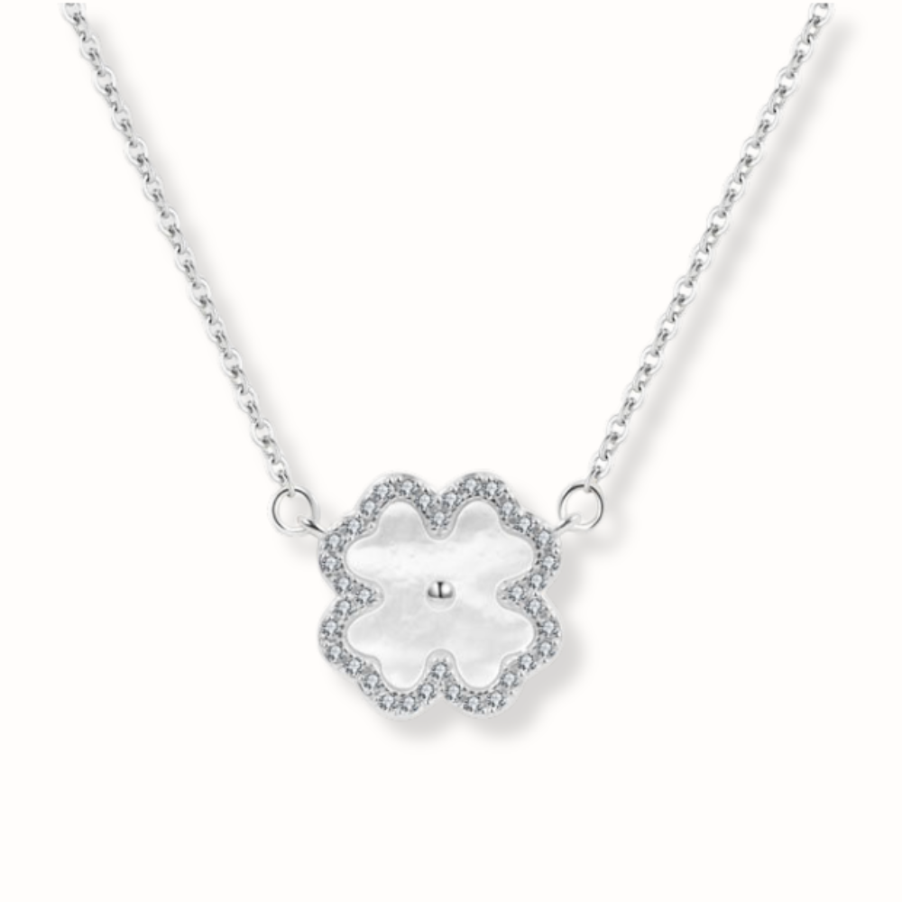 Un bijou à la fois serein et sophistiqué, ce collier présente une fleur centrale en nacre, entourée d'un halo délicat de pierres étincelantes. Fabriqué en argent 925 rhodié, il incarne la grâce et l'élégance intemporelle.