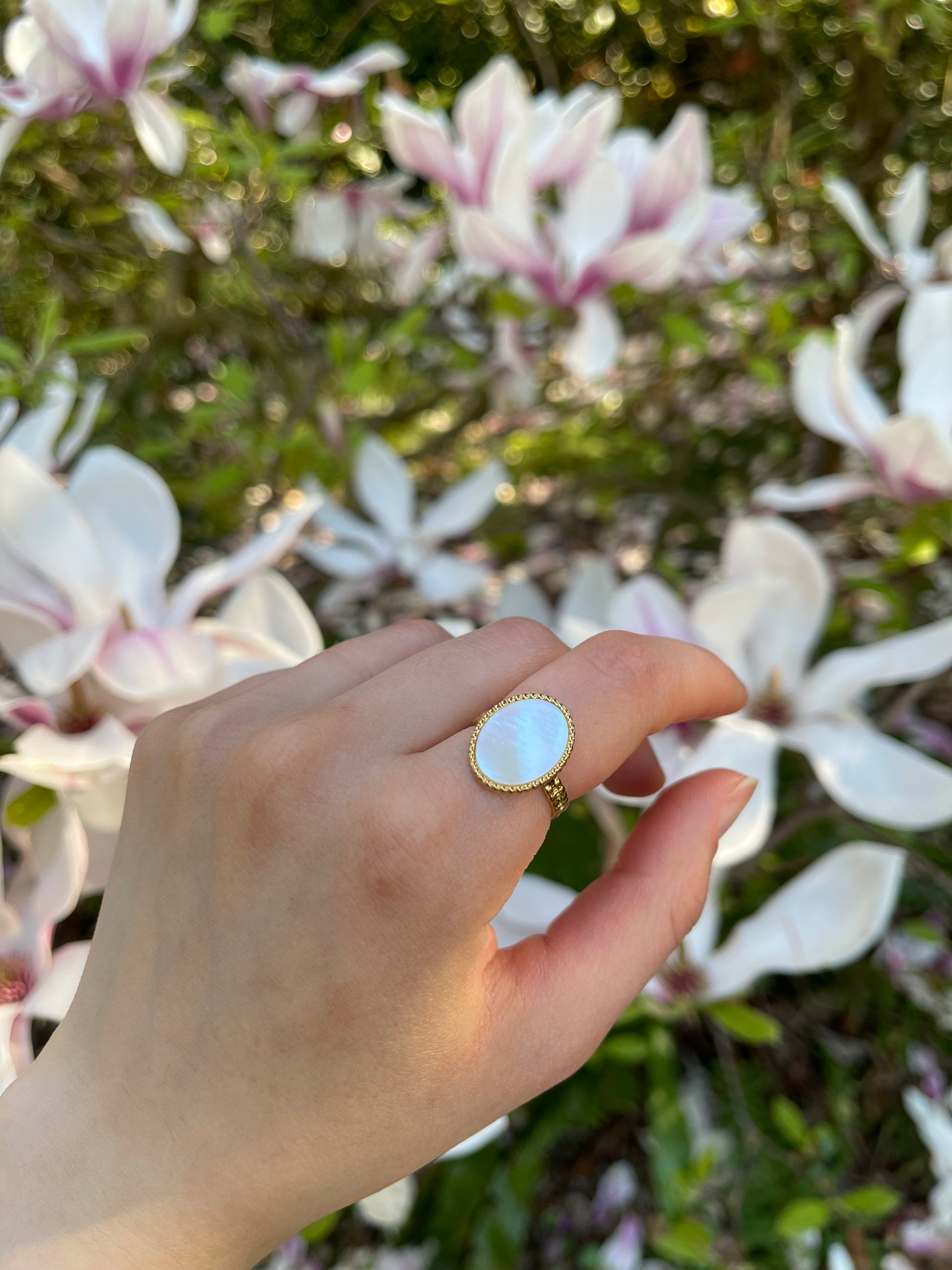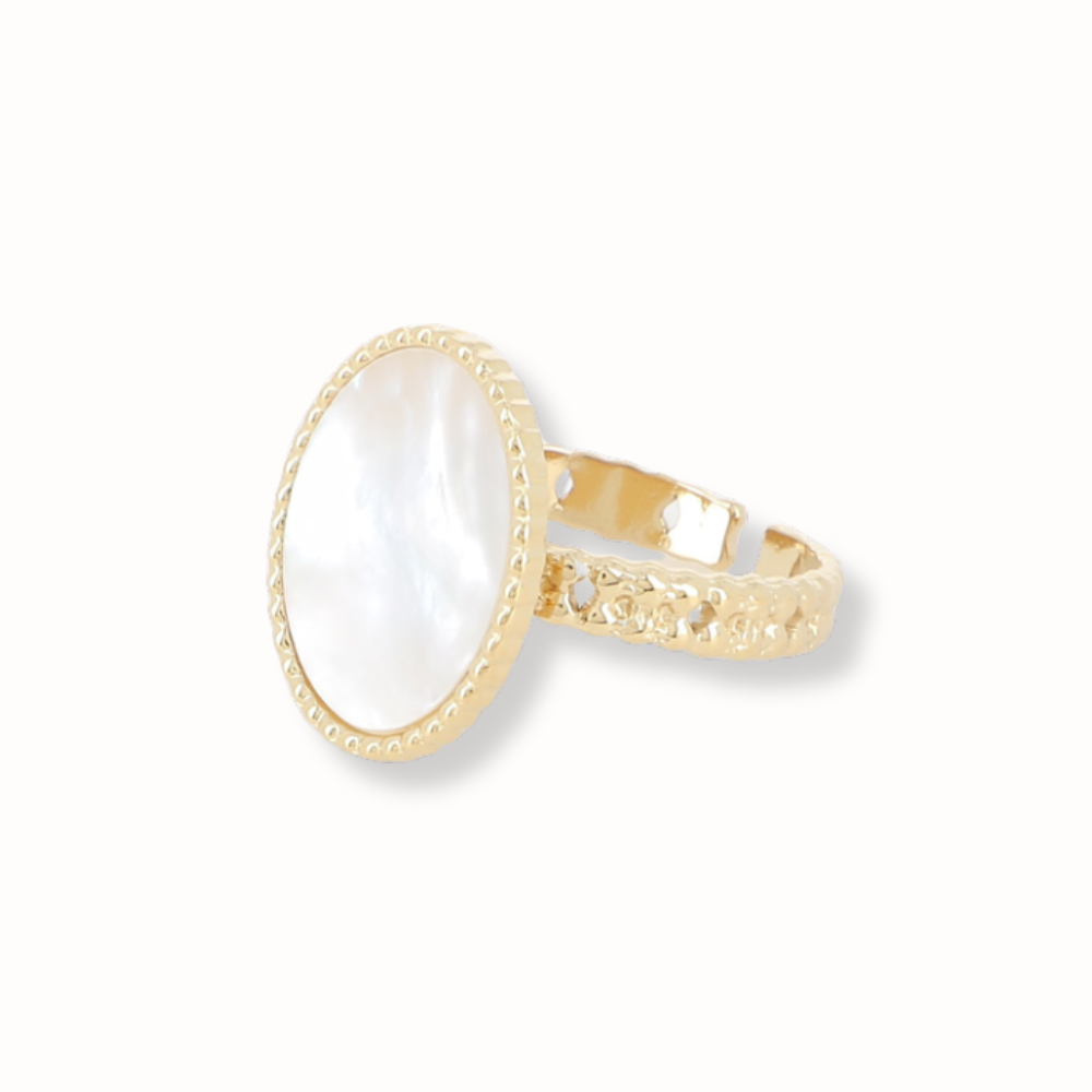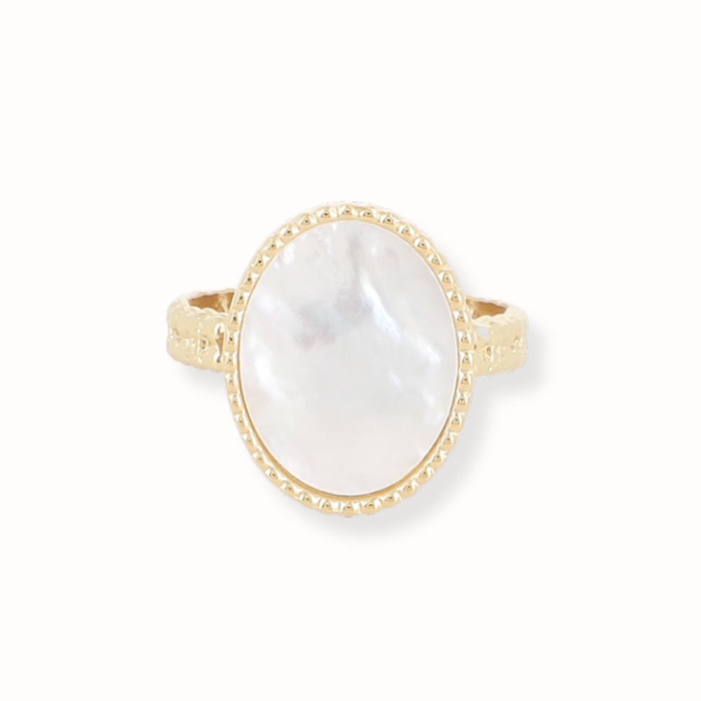 La bague GALENE est d'une élégance intemporelle, subtilement inspirée des reflets nacrés de la mer. Sa teinte douce et lumineuse s'accorde avec toutes vos tenues, ajoutant une touche sophistiquée à votre quotidien.