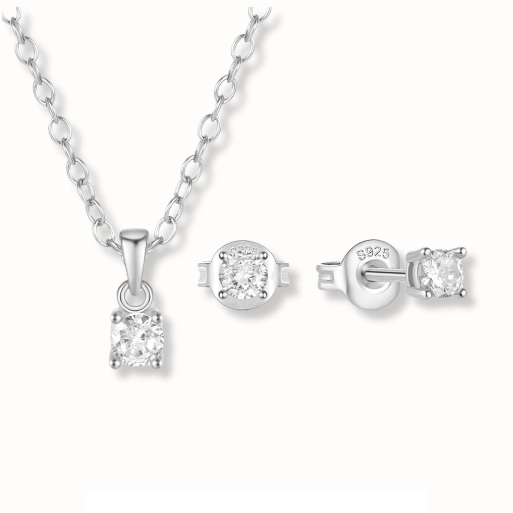 L'ensemble Milia est composé de deux pièces en argent sterling 925, dont l'éclat est préservé par un plaquage en rhodium. Très discret il est orné d'un pendentif central en zirconium qui capte la lumière et la reflète avec intensité, évoquant la pureté et la brillance des diamants les plus fins. En harmonie avec les boucles d'oreilles assorties.