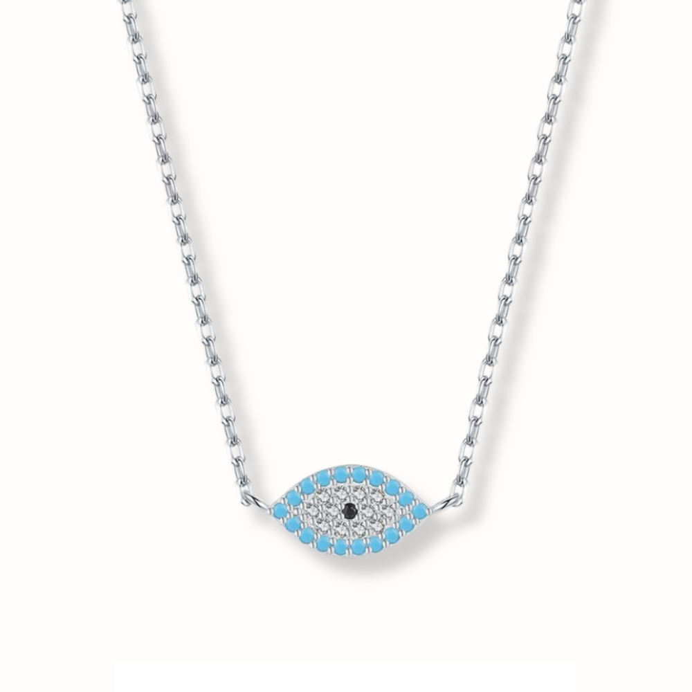 Le collier Matis est un bijou en argent sterling 925, méticuleusement plaqué de rhodium pour préserver sa brillance durable au fil du temps. Il est magnifiquement orné d'une zircone et de véritables turquoises. Son design s'inspire du Mati grec, un symbole à la fois porte-bonheur et protecteur. Vous avez également la possibilité de retrouver cette collection en bagues, en bracelets et en boucles d'oreilles, si vous souhaitez compléter harmonieusement votre ensemble.