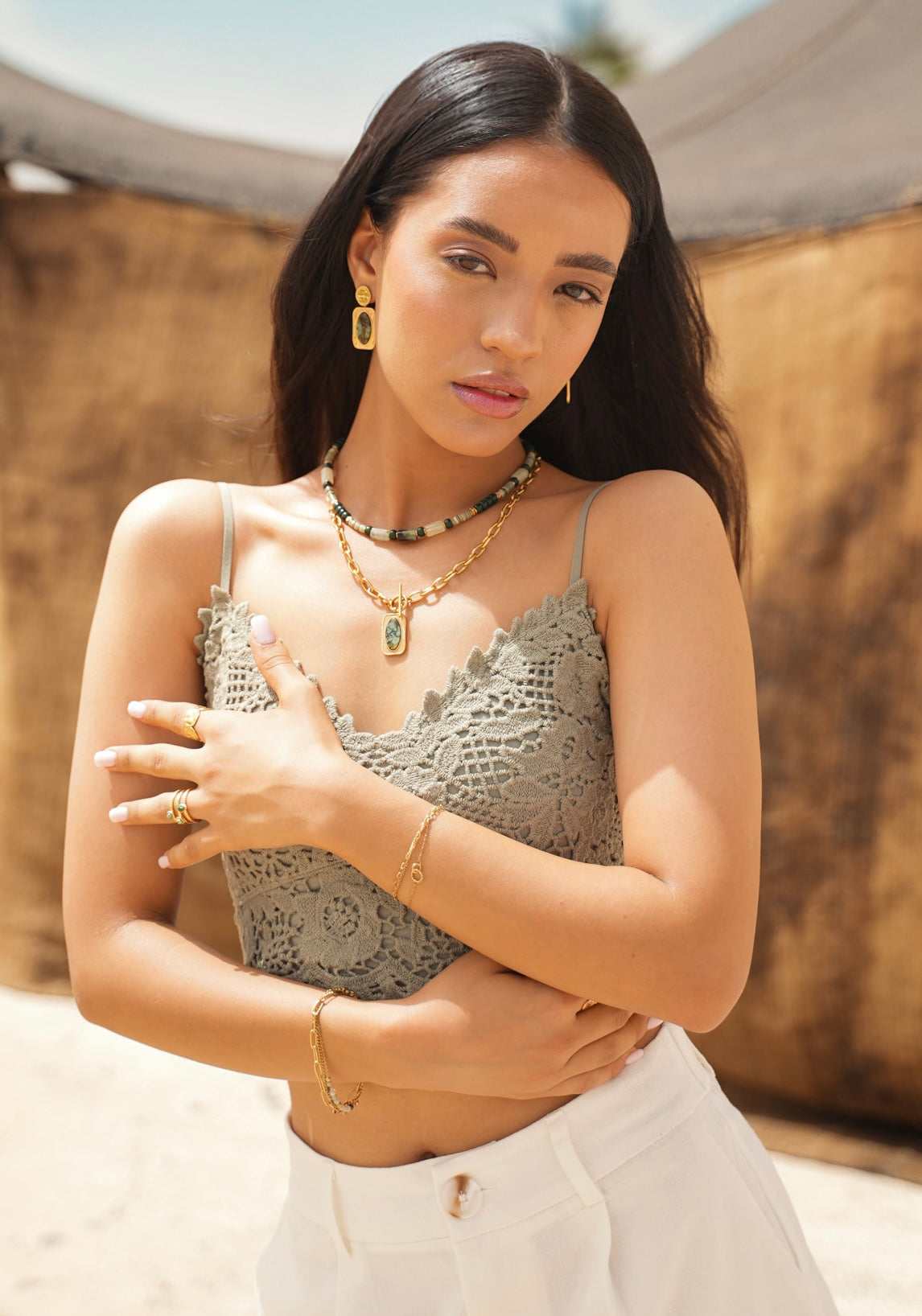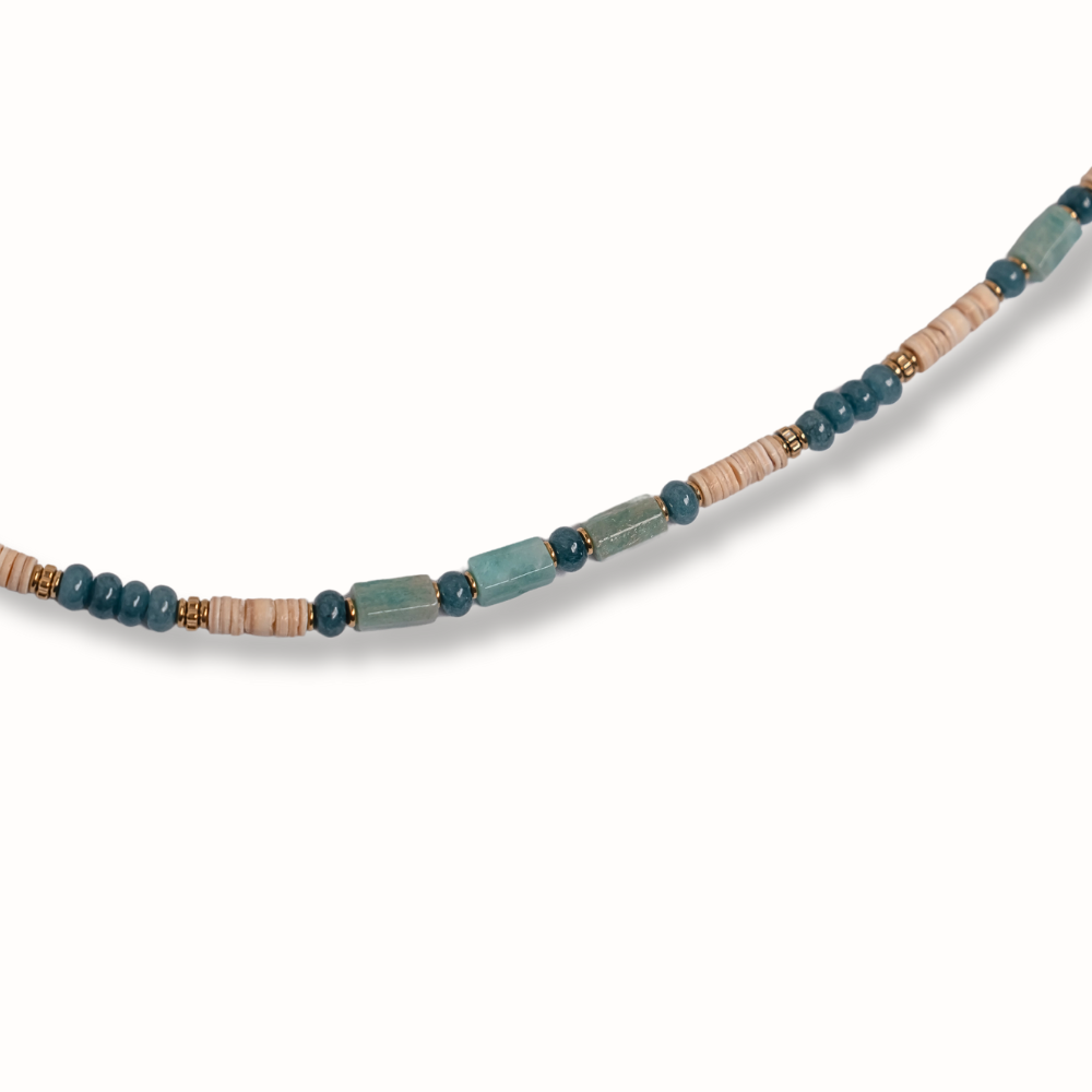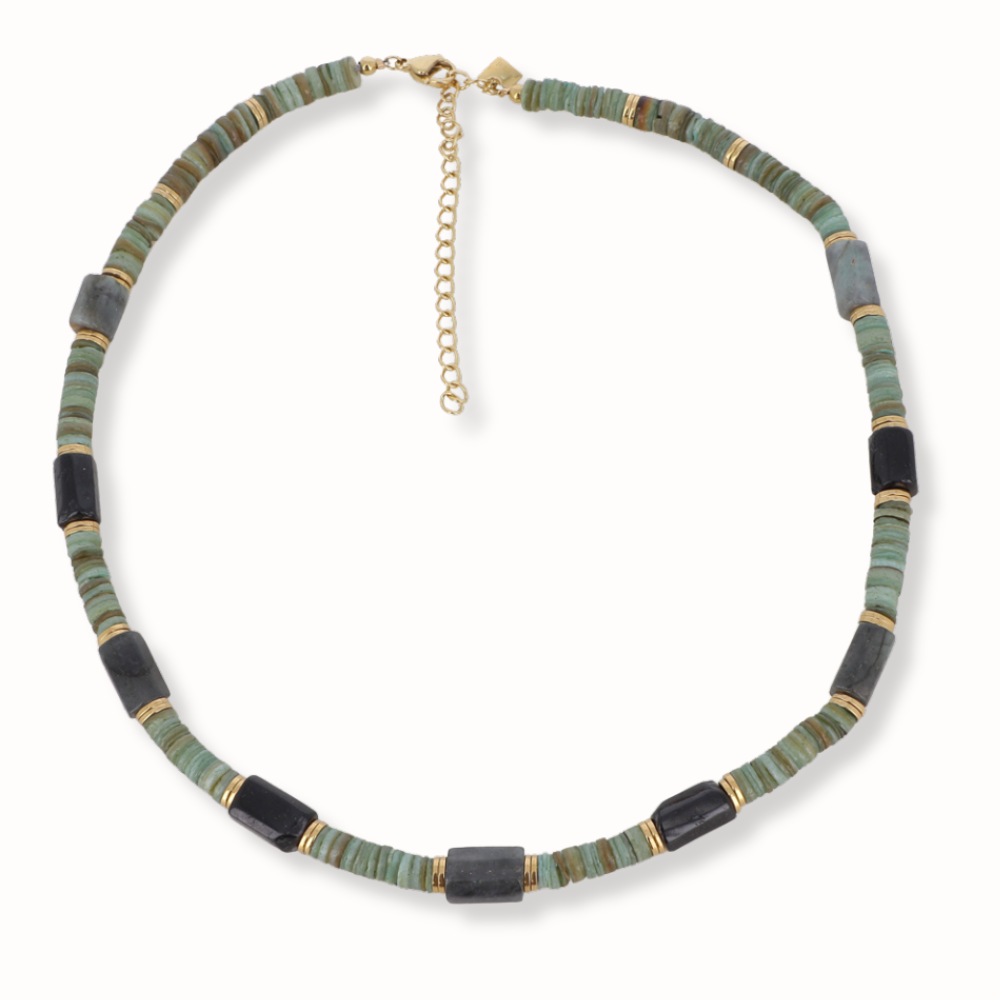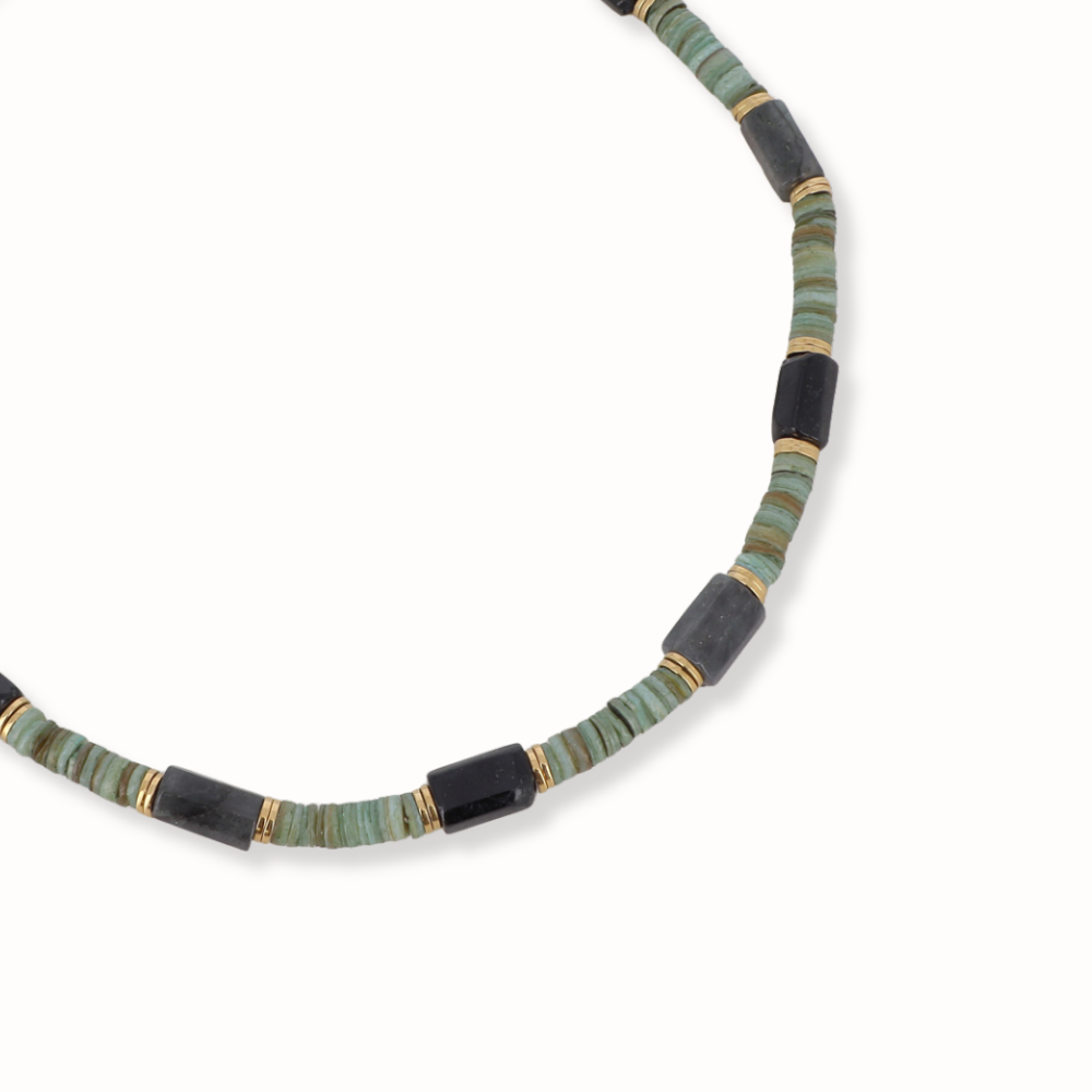 Le collier Satis est une célébration de la richesse des océans et de la terre, alliant l'essence maritime des coquillages verts à la robustesse terrestre de l'onyx et à la mystique des labradorites. Chaque segment de coquillage dégage une palette de verts apaisants, rappelant les nuances changeantes de la mer. Entre ces éclats de couleur, l'onyx noir s'insère avec autorité, offrant un contraste saisissant qui souligne la force et l'élégance. Des touches de labradorite ajoutent une dimension céleste, avec leurs reflets iridescents capturant la lumière et l'oeil.