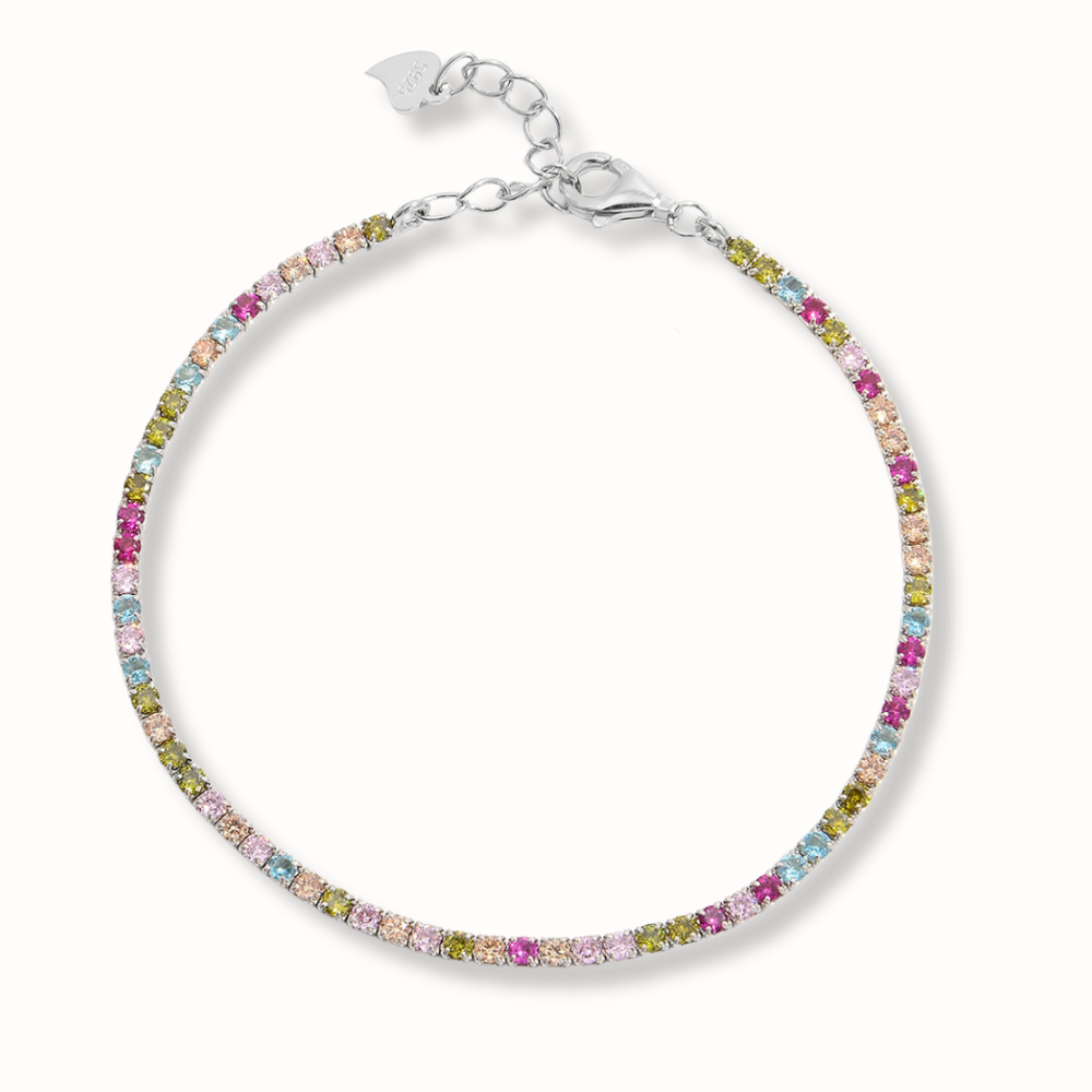 Découvrez le bracelet Soly, un bijou en argent 925 rhodié, magnifiquement orné de zircons multicolores. Chaque zircon, finement serti, crée un éclat arc-en-ciel qui ajoute une touche vibrante et joyeuse à votre tenue. Parfait pour les journées ensoleillées ou pour apporter une note de couleur à vos soirées, le bracelet Soly incarne la gaieté et l'élégance.