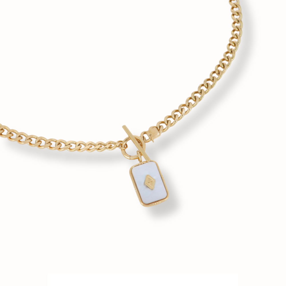 Le collier Tellia en acier inoxydable est un bijou élégant, caractérisé par un design où un losange repose avec grâce sur une pierre naturelle, complété par un fermoir cabillot.