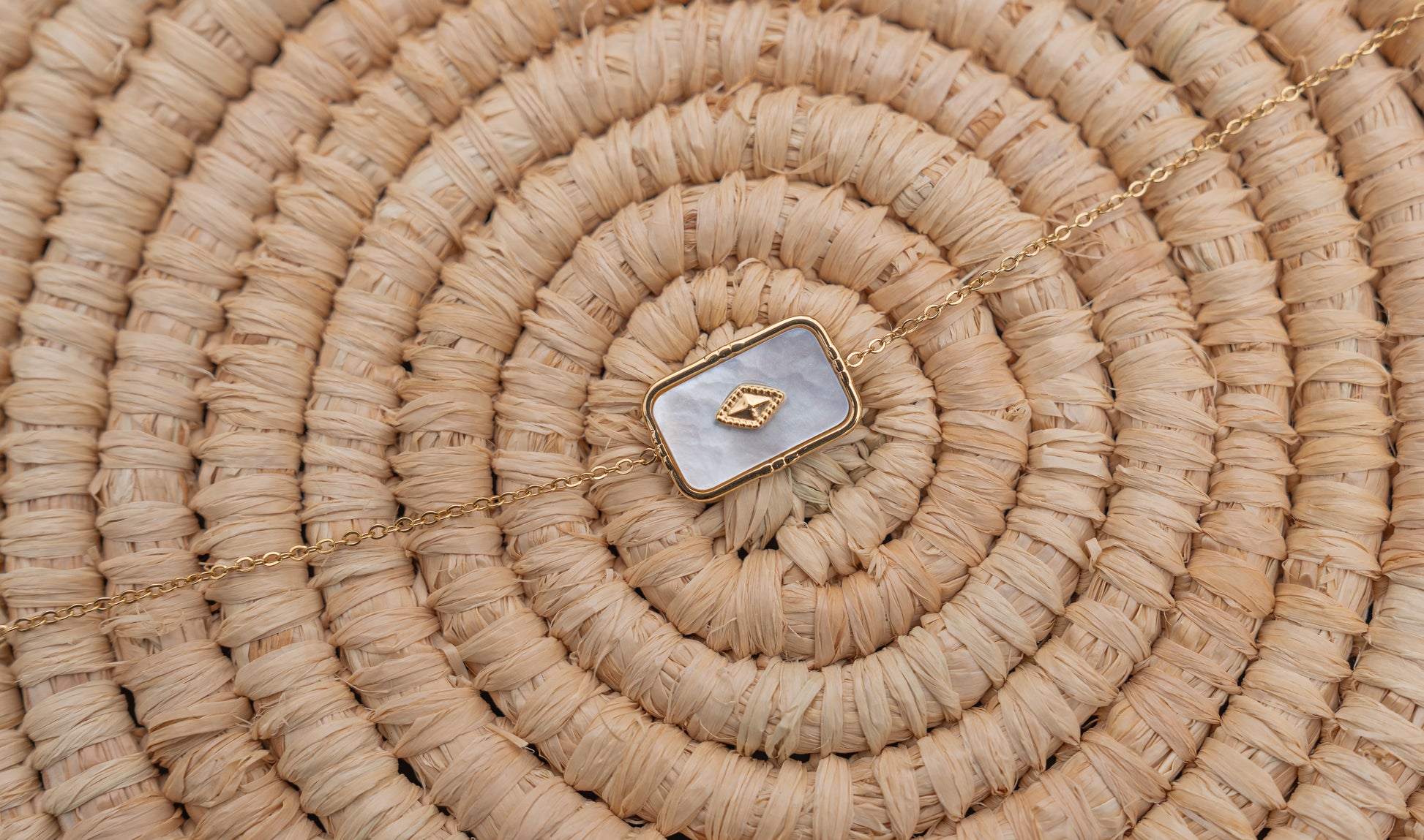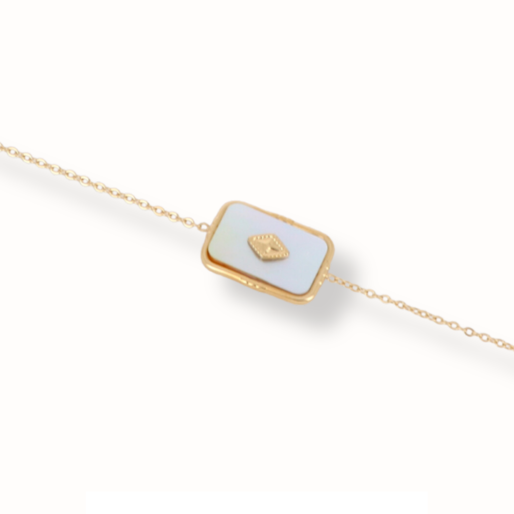 Le bracelet Tellia en acier inoxydable est une pièce élégante composée d'un losange délicatement posé sur une pierre de nacre naturelle.