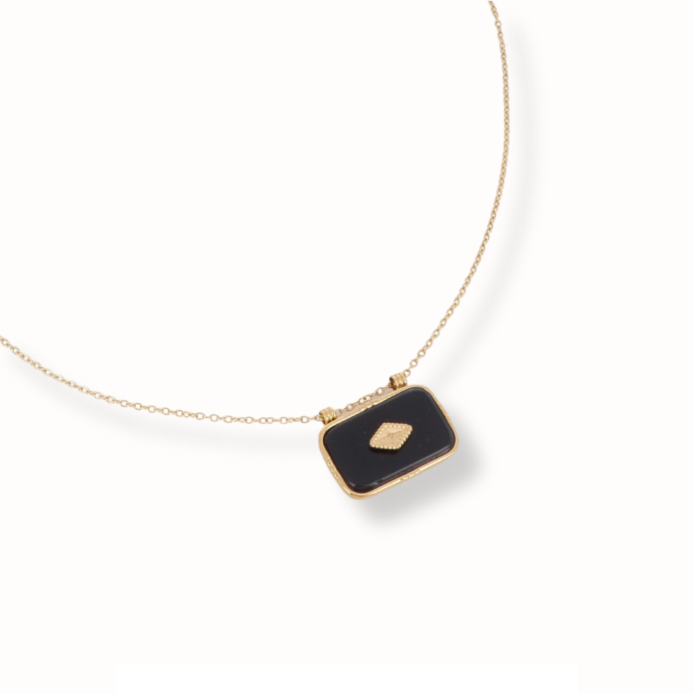 Le collier Tellia en acier inoxydable est un bijou élégant, orné d'un pendentif en forme de losange qui repose avec grâce sur une pierre naturelle d'onyx.