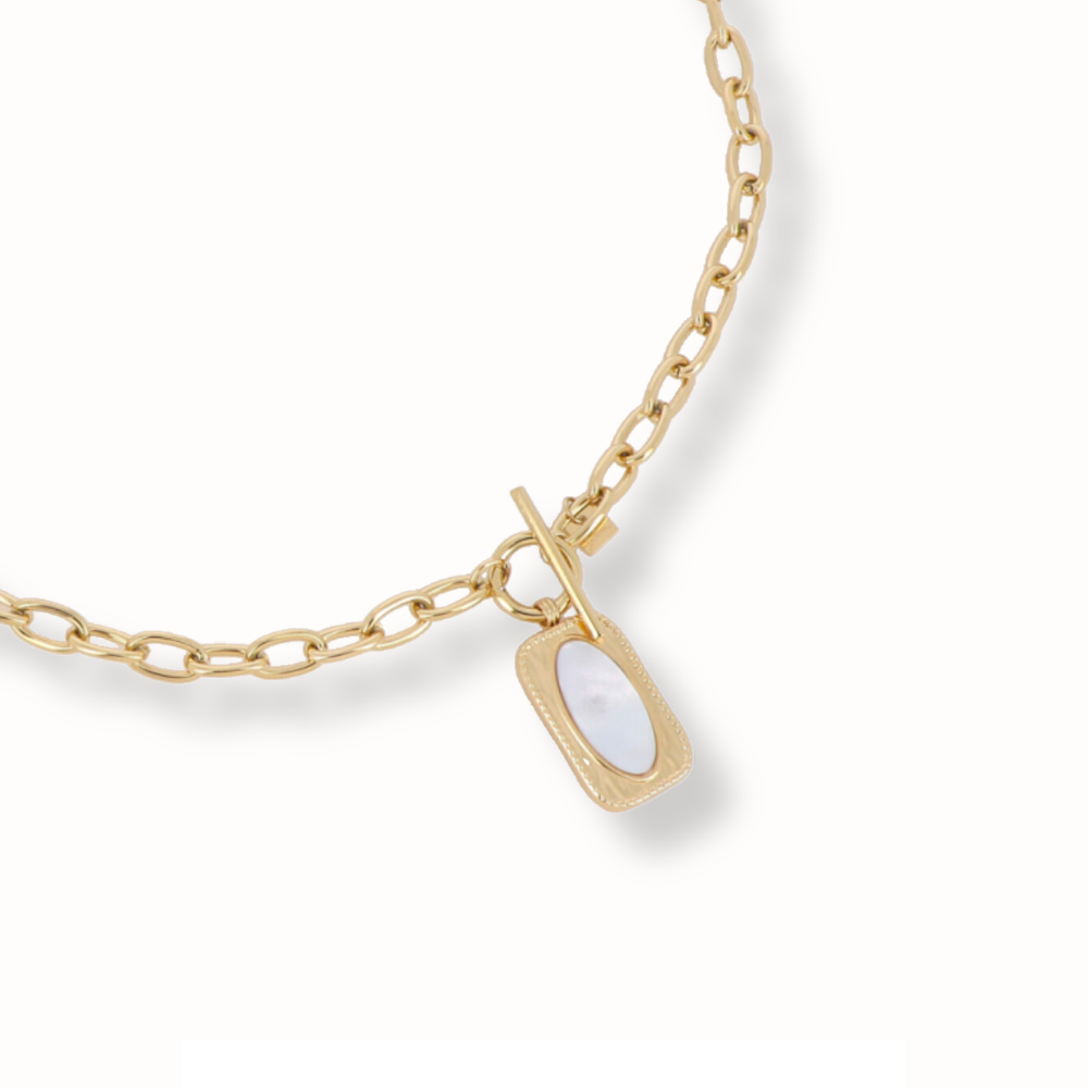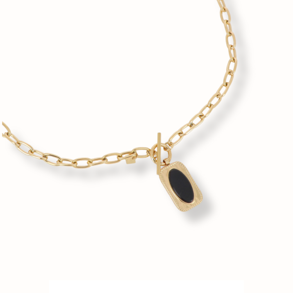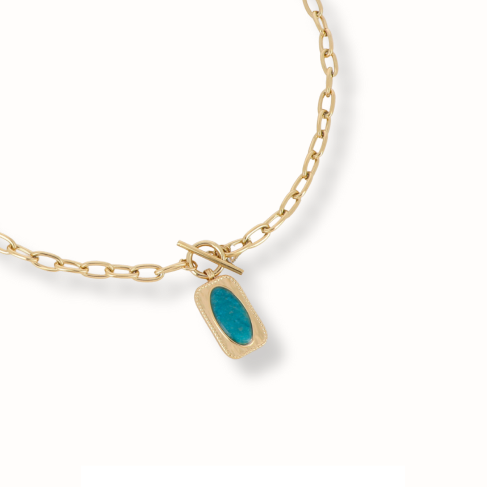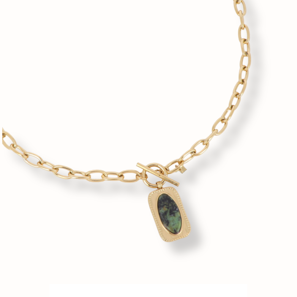 Le collier Tellos est une création en acier inoxydable, sublimée par une pierre naturelle ovale montée sur un rectangle texturé, et équipée d'un fermoir cabillot, offrant ainsi un accessoire élégant et pratique.